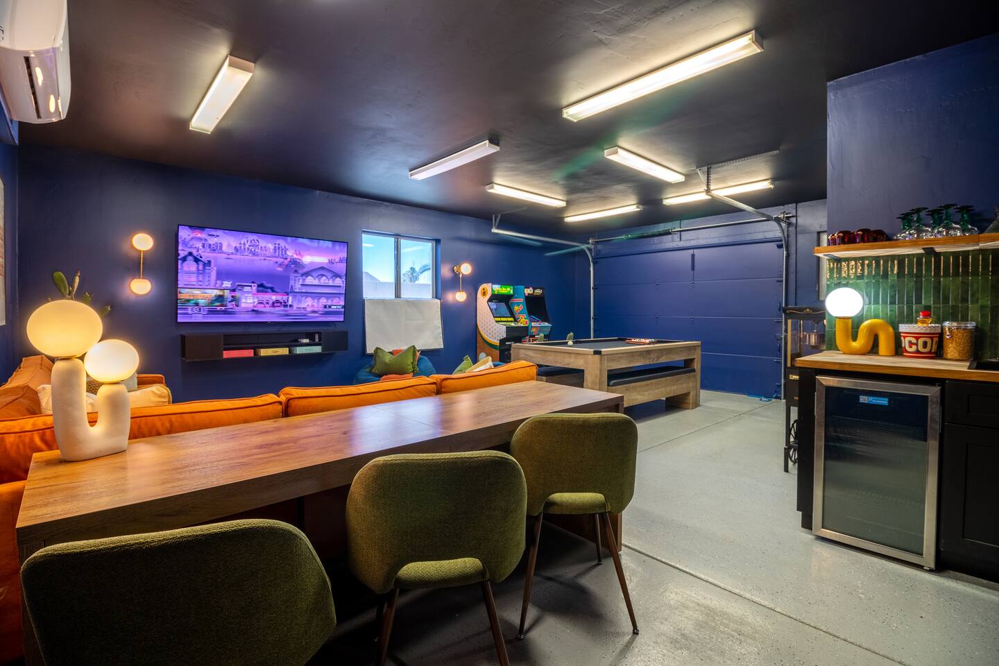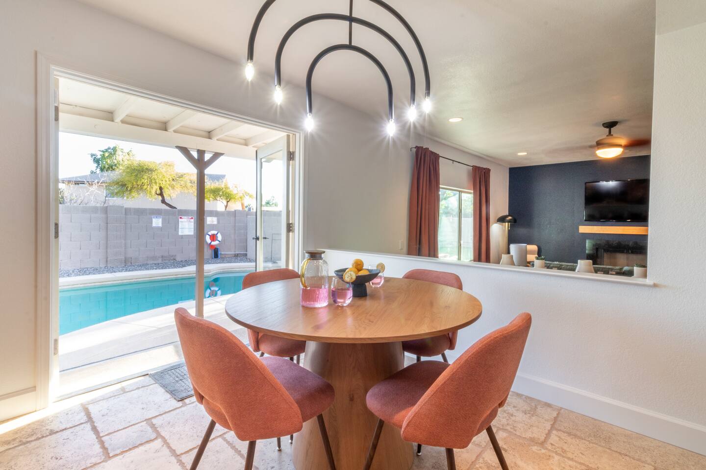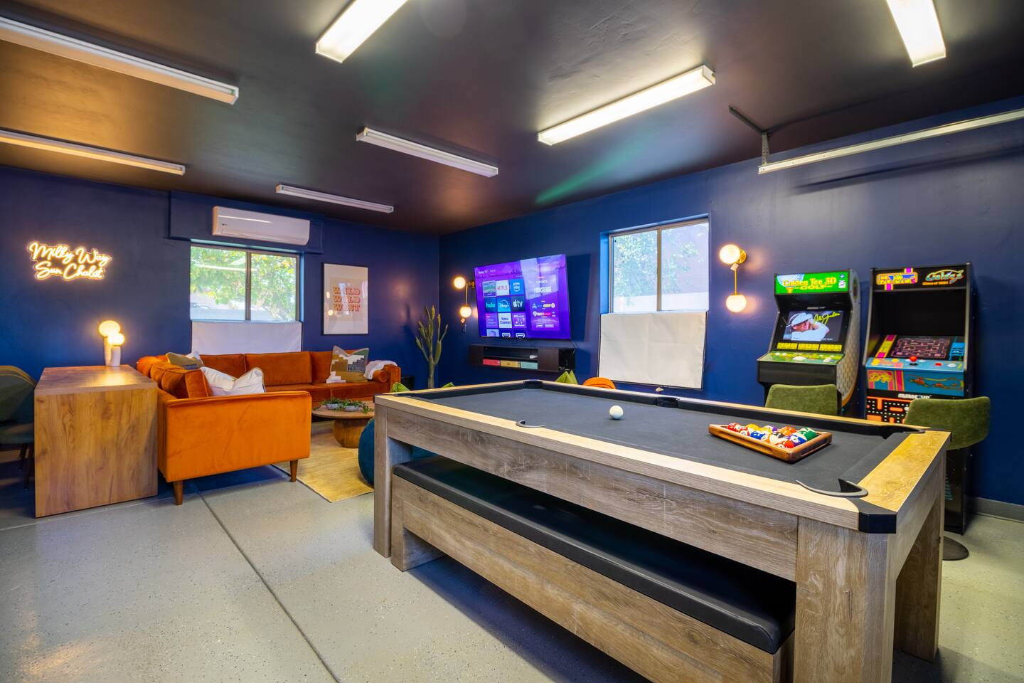 The Milky Way Sun Chalet is a gorgeous, newly renovated, professionally designed, 5 BR home has classic Southwest charm and is sure to please all! Our spacious living area, kitchen and dining areas flow seamlessly with great backyard views and lots of inviting, cozy visiting spaces. The sprawling game room with AC has a HUGE 75" TV, pool table, popcorn maker, arcade games and mini bar and those who prefer the sunshine will enjoy our poolside lounges, putting green, hot tub, heated or cooled pool and fire pit area! Don't wait to book or you might miss out on this gorgeous new listing! 🌵 LIVING ROOM🌵 ◆ Open beam ceilings, lots natural light ◆ Large sectional sofa with Pillows & Throw Blankets ◆ 65" Smart TV ◆ Comfy Accent Chairs & Ottomans ◆ Coffee Table ◆ Adjacent kitchen bar with 4 stools 🌵 KITCHEN & DINING🌵 ◆ Fully equipped Chef's kitchen ◆ Spacious countertops and cabinetry ◆ Convection oven/Microwave combo ◆ Electric Stove top ◆ Double Oven ◆ Toaster ◆ Full size Blender ◆ Individual juicing blender ◆ Air Fryer ◆ Electric skillet ◆ Rice maker ◆ Keurig Coffee Maker ◆ Double-Door Refrigerator/Freezer ◆ Dishwasher ◆ Sink - Hot & Cold purified Water ◆ Trays ◆ Serving bowls/dishes ◆ Kid friendly dishes ◆ Glasses ◆ Silverware ◆ Pots & Pans ◆ Basic Spices ◆ Commercial grade juice press ◆ 2 Dining Tables with Seating for 12 total ◆ Kitchen Bar with Seating for 4 🌵 SLEEPING ARRANGEMENTS – 5 BEDROOMS🌵 ◆Master Bedroom (upstairs): King-Size Bed, workspace/desk, ensuite bathroom with soaker tub, 50" smart TV ◆ Bedroom 2 (upstairs): Queen-Size Bed ◆ Bedroom 3 (upstairs): Queen-Size Bed ◆ Bedroom 4 (upstairs): 2 Twin Bunk Beds (4 twin beds), 43" smart TV ◆ Bedroom 5 (downstairs): Queen-Size Bed, workspace/desk, 43" smart TV ◆ Family Room: Fold out couch/bed - full size, 60" smart TV All bedrooms offer a similar set of amenities: ◆ New Memory Foam mattresses ◆ Premium Pillows, Linens, and Sheets ◆ Extra Blanket ◆ Closets with Hangers and Shelves ◆ Night Stands with Reading Lamps ◆ Luggage Racks ◆ USB charging stations 🌵 BATHROOMS 🌵 ◆ Ensuite master with double sinks, soaker tub, separate shower/toilet room ◆ Upstairs guest bath with full tub/shower and toilet room separate from single vanity ◆ Downstairs tile shower stall, toilet, single vanity ◆ Game room with private toilet All main bathrooms have essential toiletries: ◆ Hand Mirrors ◆ Shower, hand, face and make-up towels ◆ Q-tips and cotton pads ◆ Hair Dryers ◆ Shampoo, conditioner, shower gel ◆ Hand soap and lotion 🌵 GAME ROOM 🌵 This converted 3rd bay garage space air conditioned and fully insulated with a mini-bar and its own private toilet room. ◆ Pool Table converts to ping pong and dining table ◆ Vintage theater style popcorn maker ◆ Dart board ◆ Cozy Sectional Sofa with Pillows ◆ Bean bag chairs ◆ 75"Smart TV ◆ Arcade games ◆ Board games ◆ Mini Bar (glasses, sink, mini-fridge) 🌵BACKYARD 🌵 ◆ Heated/Cooled Pool (no extra charge, but temperature may vary based on weather conditions) ◆ Jetted Hot tub ◆ Putting Green with glow in the dark balls ◆ Yard Games (Cornhole, Life-Size Connect 4, bocce ball) ◆ Fully turfed yard ◆ Outdoor hanging lights and patio fans ◆ Covered Couch/Seating Area Under Patio ◆ Covered outdoor Dining Table ◆ 6 Sun Lounges with 2 umbrellas ◆ Gas BBQ ◆ Gas Firepit ◆ Lemon Tree with fruit picker (seasonal fruit) Both side yard access gates are locked for the safety of all given that we DO NOT have safety fencing or a gate around the pool. Guests must sign a separate hot tub and pool waiver within 48 hours of booking to confirm reservation. 🌵 NEIGHBORHOOD 🌵 ◆ Community walking path directly behind our house ◆ Quiet, peacefully neighborhood ◆ 2 community parks within walking distance have basketball courts, sand volleyball courts, playgrounds, tennis courts, a pond and even a train ride (Desert Breeze Park and Mountain View Park) ◆ 6 min (1.9 mi) to Chandler Fashion Center Mall ◆ 15 min (11 mi) to Sloan Park (Cubs Baseball Stadium) ◆ 12 min (5.9mi) to Firebird Motorsports Park ◆ 20 min (14 mi) to Top Golf - Gilbert ◆ 21 min (17 mi) to Phoenix Zoo ◆ 23 min (18 mi) to Chase Field (Arizona Diamondbacks) ◆ 28 min (18 mi) to PHX arena (Phoenix Suns) ◆ 21 min (13 mi) to Arizona State University Campus ◆ 20 min (17 mi) to Revel Surf ◆ 18 min (14 mi) to PHX Sky harbor Airport ◆ 25 min (15 mi) to Mesa Gateway Airport *Drive times are estimates and may vary greatly depending on traffic Arizona TPT license # 21600025 City of Chandler license # 309122